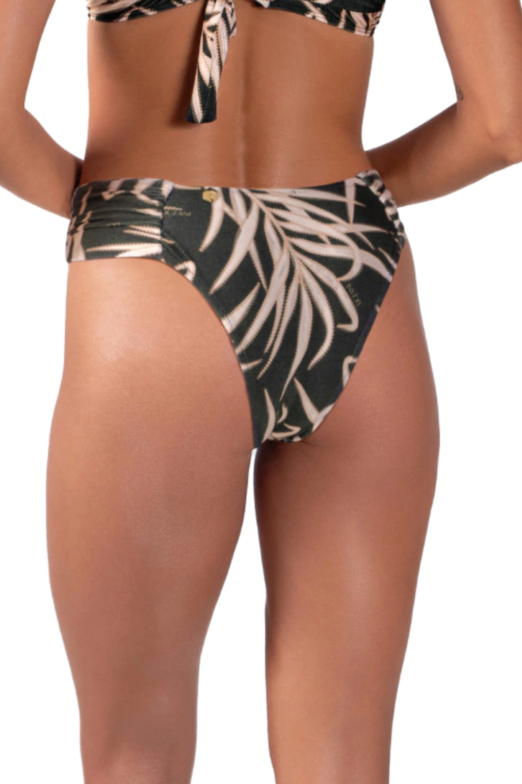 A tanga, com faixas franzidas e sem elástico nas laterais, garante um caimento perfeito e não marca o quadril, graças à sua modelagem maior e elegante.
